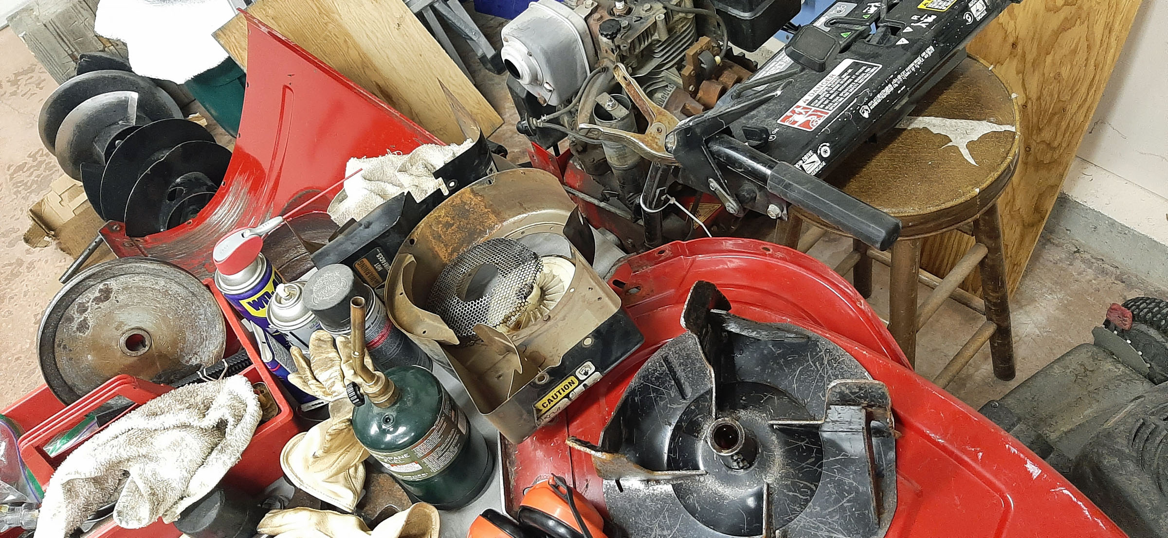 With luck, after I get some new parts, these snowblower pieces will fit back together (with no extra parts left on the floor). The dream is to once again have a snowblower that will throw snow further than 3 feet and will start without being preheated with a hair drier.